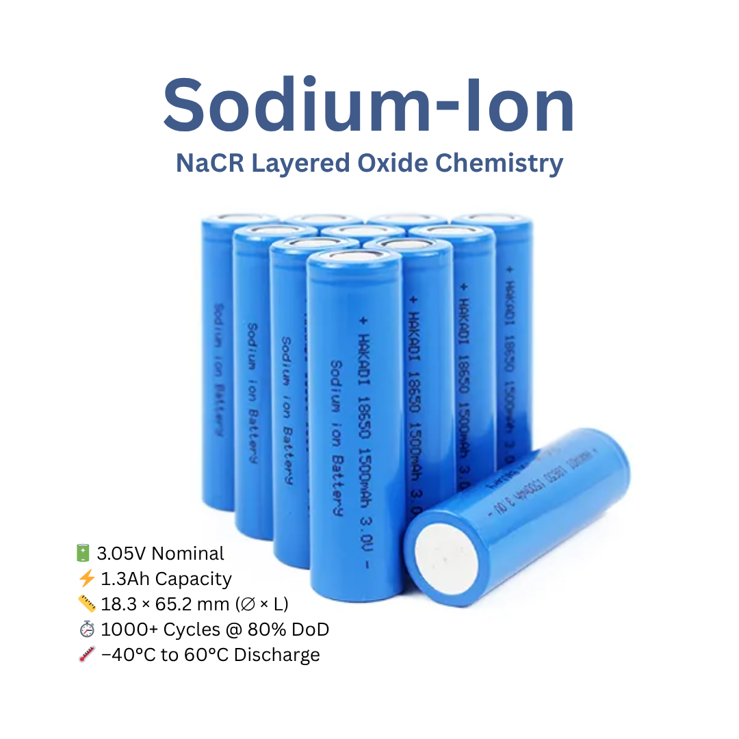 These NaCR-series sodium-ion cells are a practical, sustainable alternative to lithium-ion. Compared to LFP, they maintain stronger low-temperature performance and rely on abundant materials. The NaCR chemistry is a NaCrO₂-type layered-oxide cathode, delivering a nominal 3.05 V with a wide operating window and excellent cold-weather discharge capability.