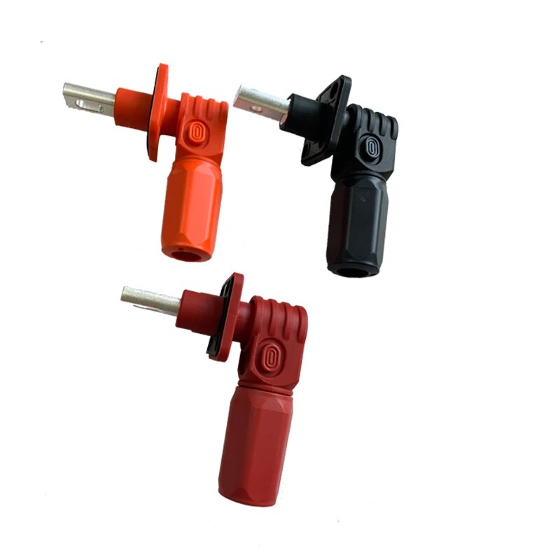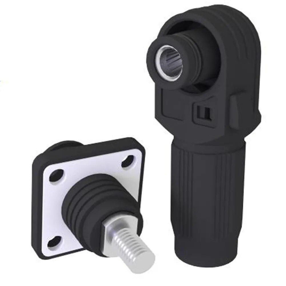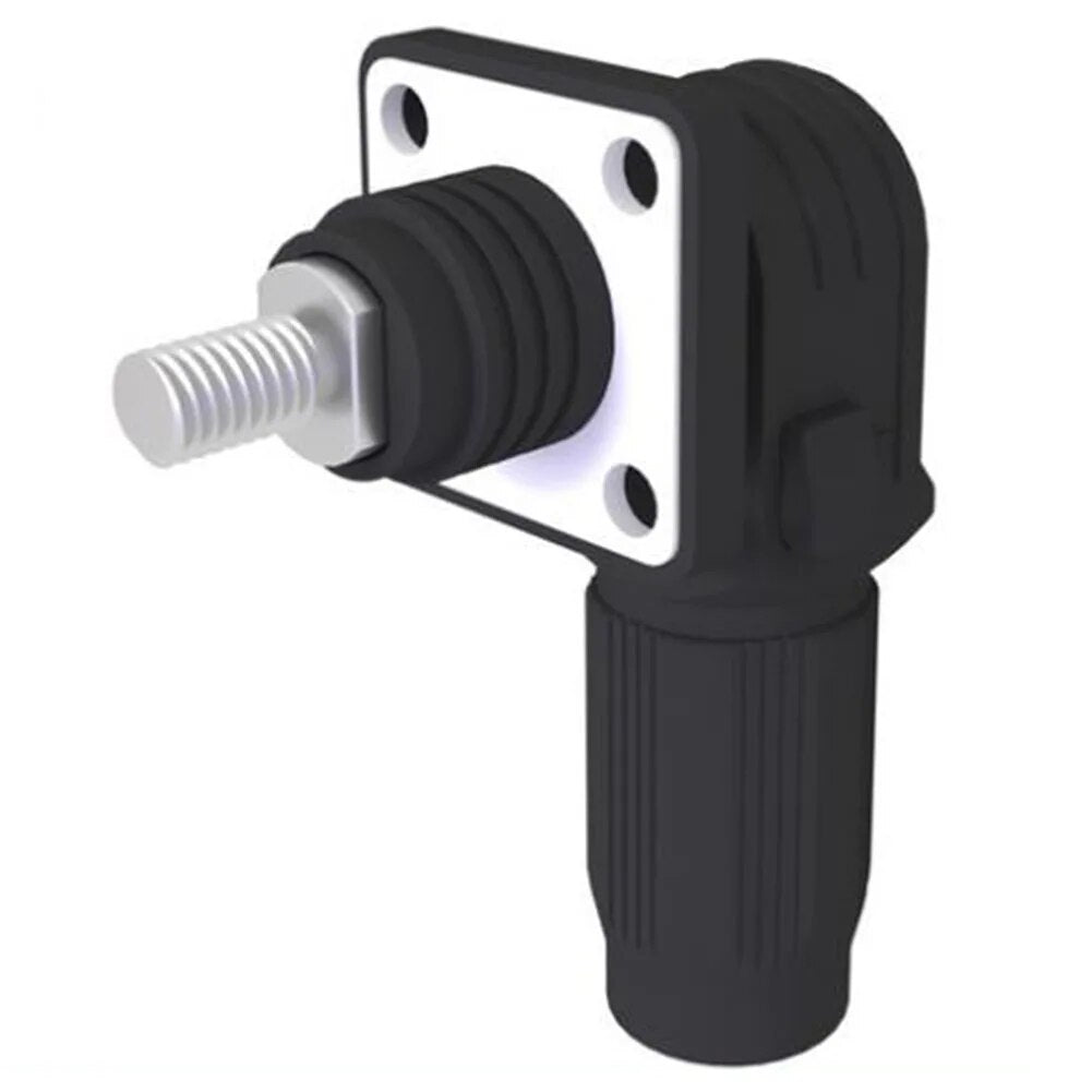 This environmentally sealed connector features robust metal parts with silver plating, it ensures a secure connection. It is equipped with a 360-degree rotating plug connection for added flexibility. This includes a panel mount connector with a busbar terminal and a right-angle cable plug.
